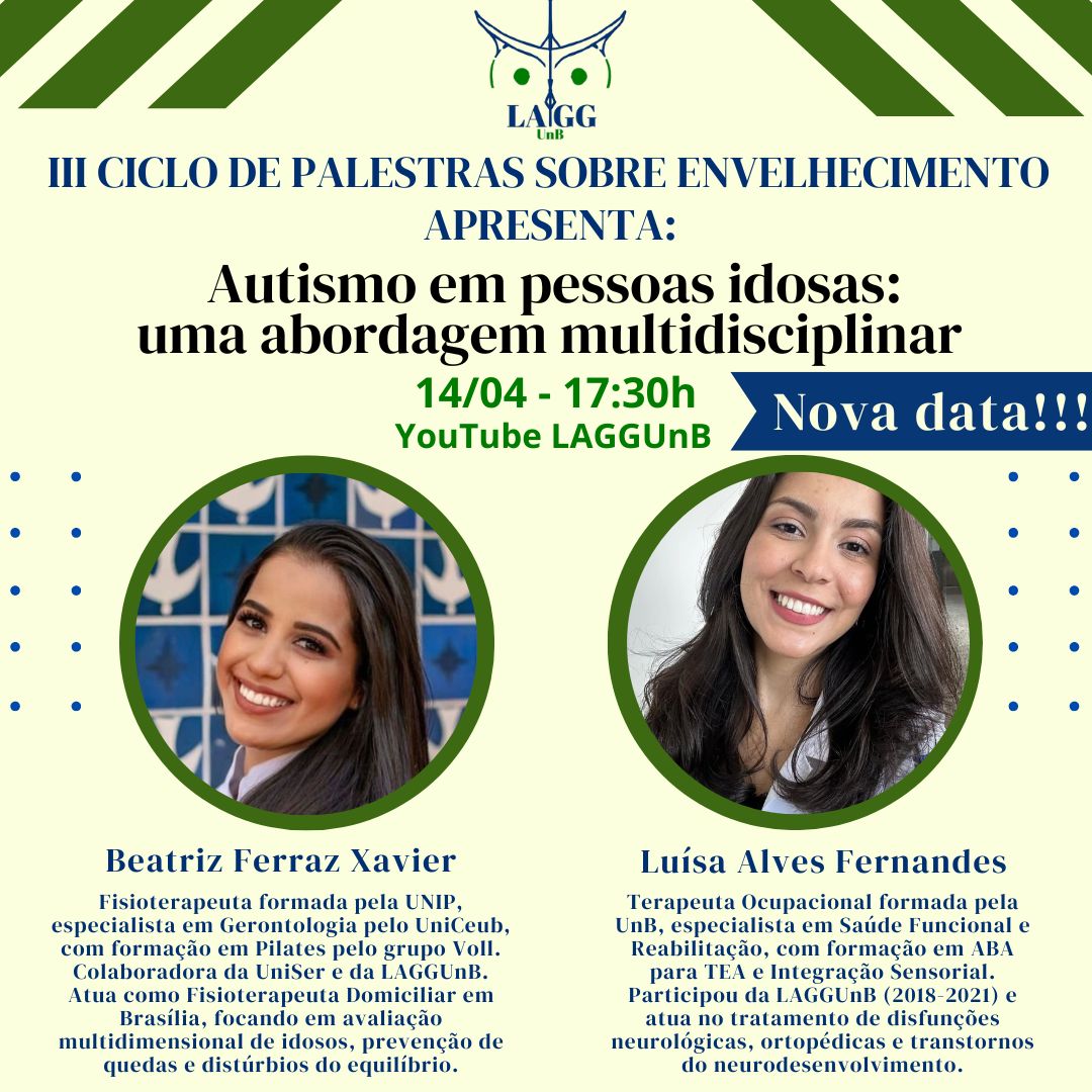 Com nova data, no dia 14/04 às 17:30, a fisioterapeuta Beatriz Ferraz e a Terapeuta Ocupacional Luísa Alves estarão falando sobre "Autismo em pessoas idosas: uma abordagem multidisciplinar".